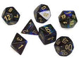 7-Die Set Lustrous: Shadow/Gold. Includes: 4-sided, 6-sided, 8-sided, 10-sided, percentile, 12-sided, and 20-sided gaming die