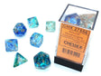 7-Die Set Oceanic/Gold. Includes: 4-sided, 6-sided, 8-sided, 10-sided, percentile, 12-sided, and 20-sided gaming die