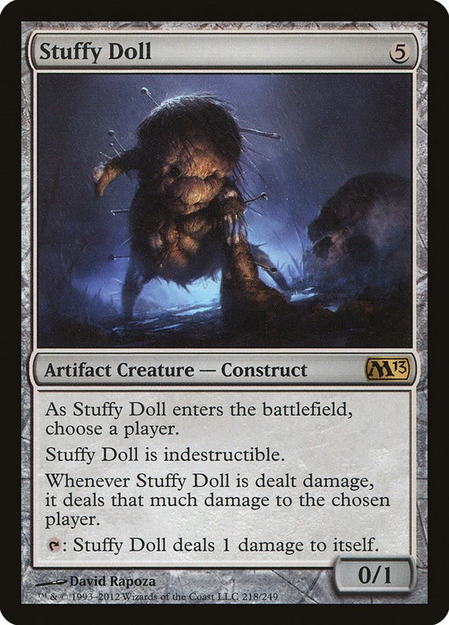 - Rules Text Contains: As Stuffy Doll enters the battlefield, choose a player. <br> Stuffy Doll is indestructible. <br> Whenever Stuffy Doll is dealt damage, it deals that much damage to the chosen player. <br> T: Stuffy Doll deals 1 damage to itself.