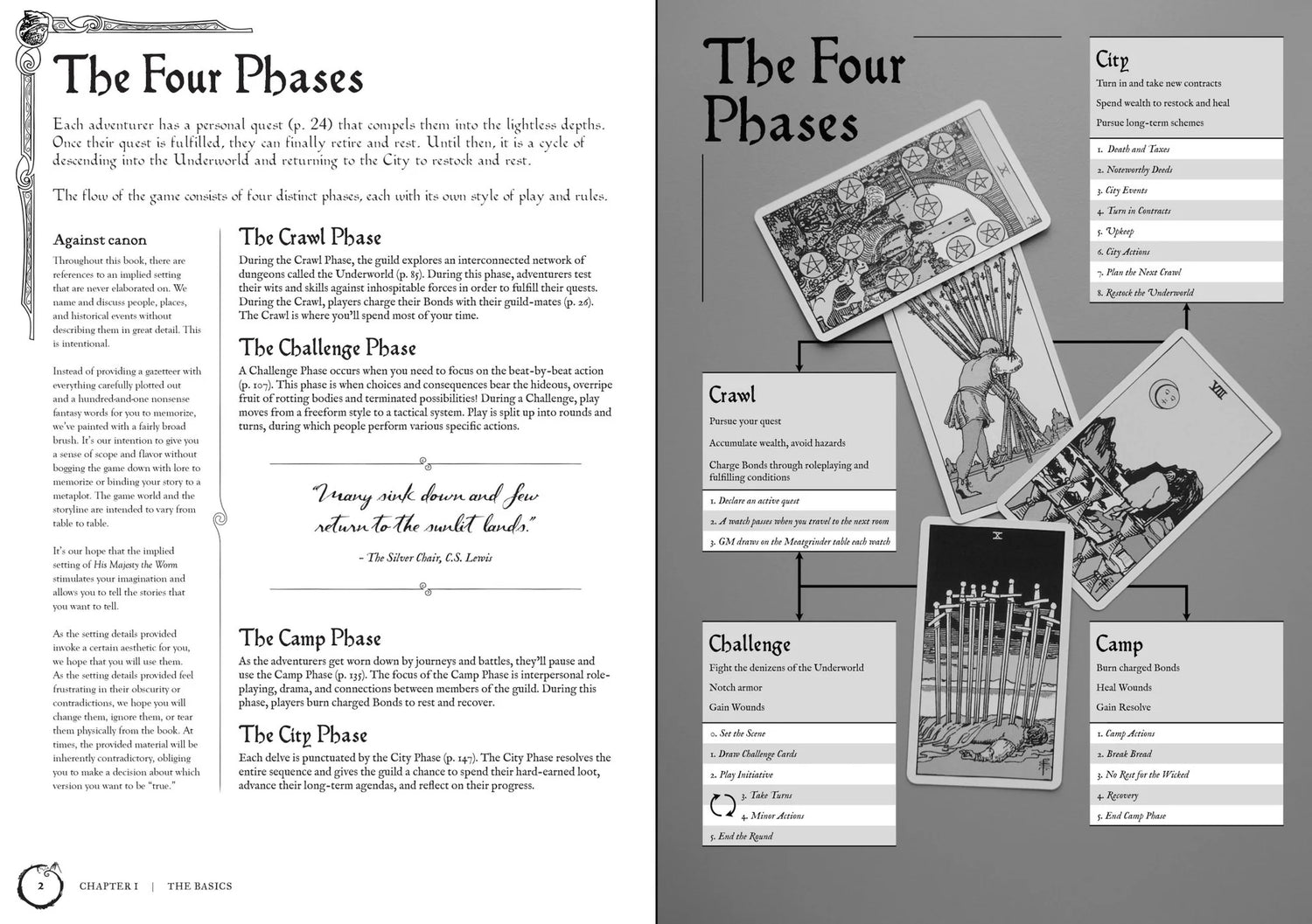 The game is intended for a traditional setup between a single GM and 3-6 players. It emphasizes long-term, Metroidvania-like play. The book is 404 pages long, split up over 10 chapters and 5 appendices. The print edition is silver foil stamped and has a ribbon bookmark. The digital edition is thoroughly cross-linked, with a robust index. It is a complete game with everything you need in one tome (just add a tarot deck).