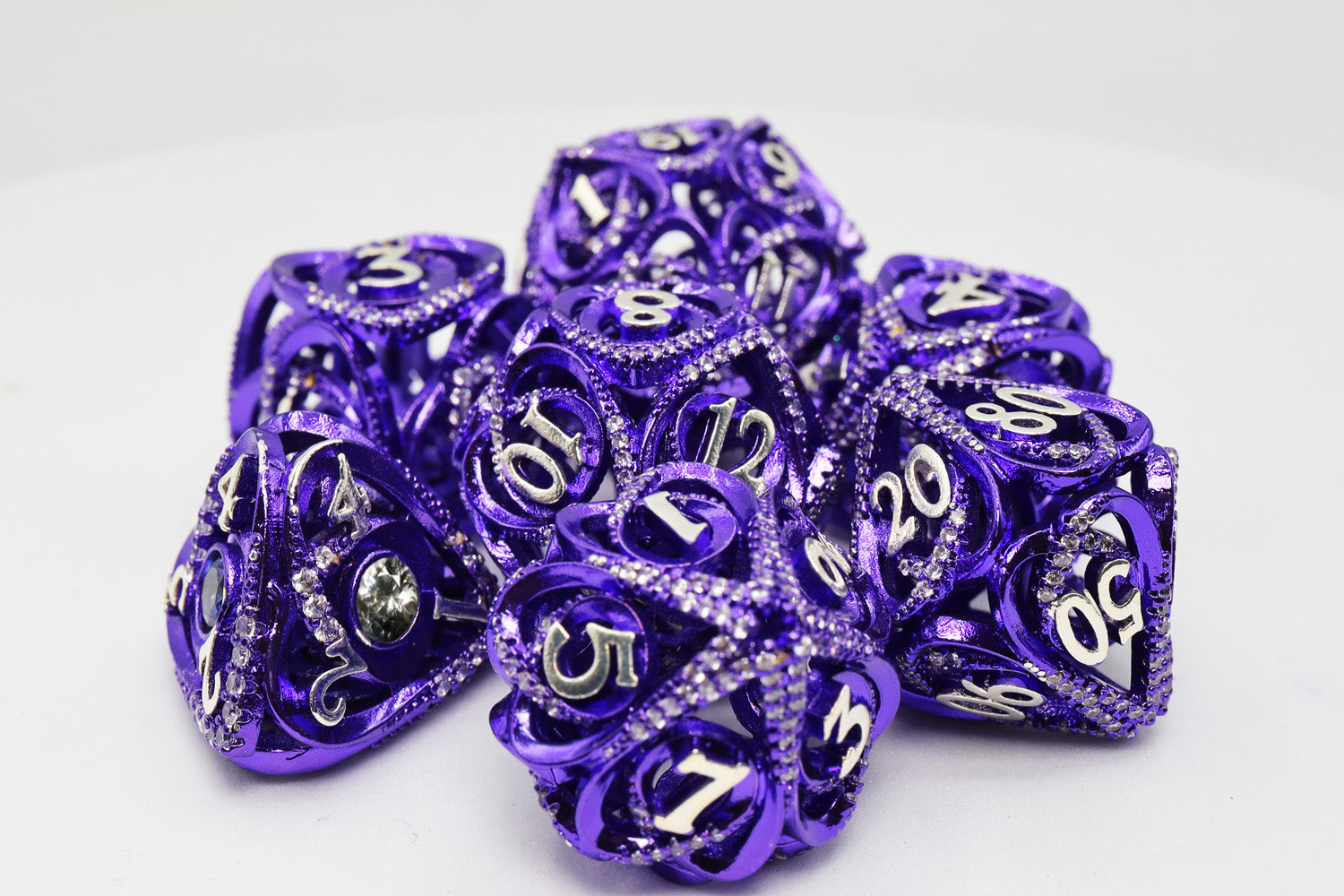 Our jeweled sets expand on the Hollow Hearts design with small gemstones embedded on the surface of the dice. These gemstones add a beautiful accent to the dice sets.