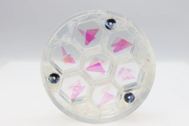 This beautifully made resin circular dice vault is perfect to carry your favorite dice in! The honeycomb design is made to hold one standard size 7 piece RPG dice set. It also features 3 powerful magnetic closures sunk into the resin to keep your dice secure.