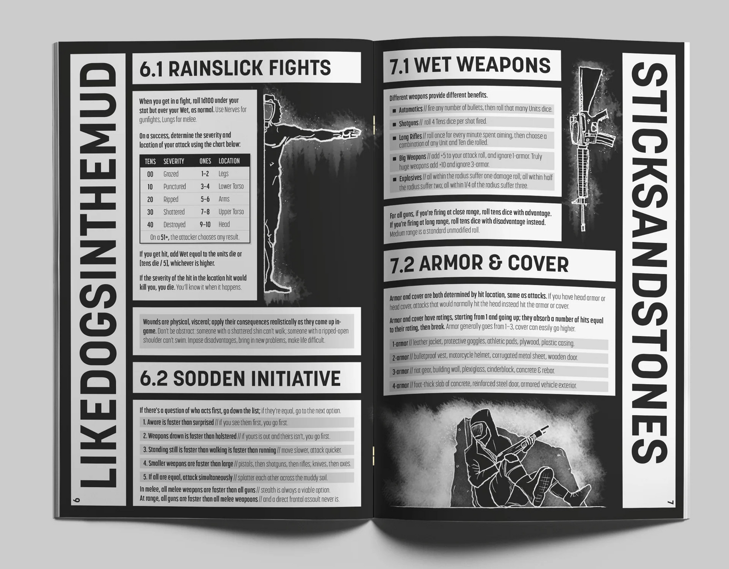 - A straightforward d100 roll-under-over system using stats and your character's slowly-rising Wet score